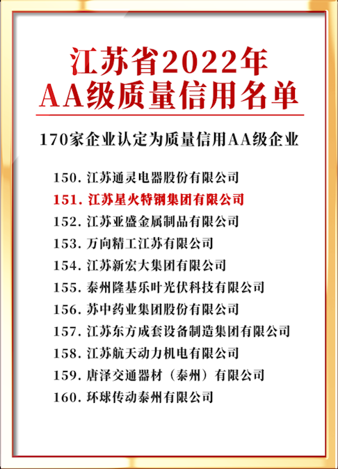 為加快推進(jìn)質(zhì)量誠(chéng)信體系建設(shè),推動(dòng)質(zhì)量信用分級(jí)分類監(jiān)管,引導(dǎo)企業(yè)強(qiáng)化質(zhì)量誠(chéng)信意識(shí),根據(jù)《江蘇省質(zhì)量提升行動(dòng)實(shí)施方案》(蘇發(fā)〔2018〕12號(hào))和《江蘇省“十四五”社會(huì)信用體系建設(shè)規(guī)劃》(蘇政辦發(fā)〔2021〕42號(hào))精神,省市場(chǎng)監(jiān)管局、發(fā)展和改革委員會(huì)聯(lián)合開展了2022年度江蘇省質(zhì)量信用AA級(jí)及以上企業(yè)等級(jí)認(rèn)定工作。經(jīng)自主申報(bào)、信用審查、材料評(píng)審、組織考核、征求意見、公示等程序,全省50家企業(yè)認(rèn)定為質(zhì)量信用AAA級(jí)企業(yè),170家企業(yè)認(rèn)定為質(zhì)量信用AA級(jí)企業(yè),現(xiàn)予以公布。