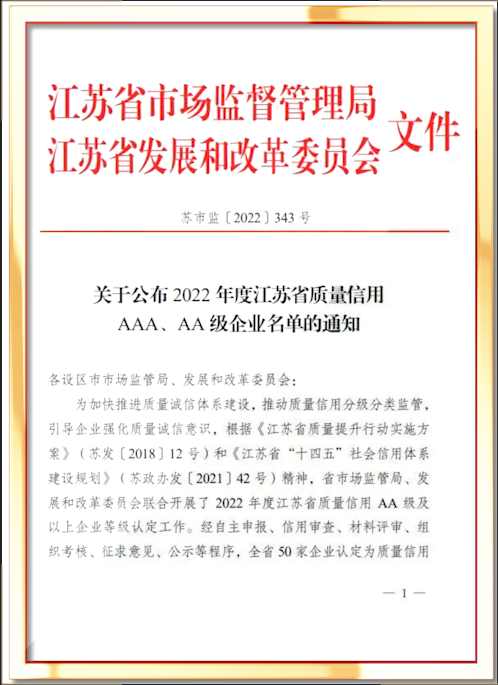 省市場(chǎng)監(jiān)管局、發(fā)展和改革委員會(huì)聯(lián)合開展了,2022年度江蘇省質(zhì)量信用AA級(jí)及以上企業(yè)等級(jí)認(rèn)定工作,50家企業(yè)認(rèn)定為質(zhì)量信用AAA級(jí)企業(yè),170家企業(yè)認(rèn)定為質(zhì)量信用AA級(jí)企業(yè)。
